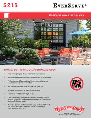 EverServe® Aluminum Glass Door model 521S is a sectional aluminum door appropriate for environments where maximum light infiltration and/or visual access is required. Designed to fit openings up to 20’2″ (6147 mm) wide and 18’1″ (5512 mm) high, the Model 521 features a wide, 2-11/16″ (68 mm) center stile, 3-3/4″ (95 mm) or 4-1/2″ (114 mm) bottom rail, based on door size.