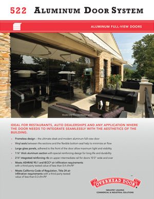Aluminum Glass Door model 522 is designed in sizes up to 18’ 2” (5486 mm) wide and 14’ 1” (4318 mm) high. This aluminum full-view door, featuring a frameless design, is ideal for restaurants, auto dealerships and any application where the door needs to integrate seamlessly with the aesthetics of the building. Available with five glass options.