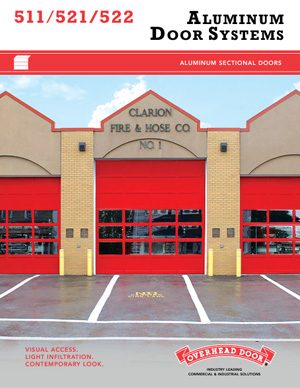 EverServe® Aluminum Glass Door model 521S is a sectional aluminum door appropriate for environments where maximum light infiltration and/or visual access is required. Designed to fit openings up to 20'2" (6147 mm) wide and 18'1" (5512 mm) high, the Model 521 features a wide, 2-11/16" (68 mm) center stile, 3-3/4" (95 mm) or 4-1/2" (114 mm) bottom rail, based on door size.